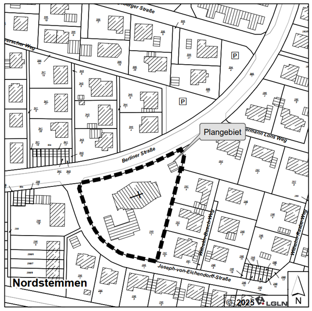 Der Geltungsbereich des Bebauungsplans Nr. 0103 A „Schratfeld“, 8. Änderung befindet sich südlich der Berliner Straße und westlich die Joseph-von-Eichendorff-Straße in der Ortschaft Nordstemmen und ist in der Karte „schwarz“ umrandet dargestellt.